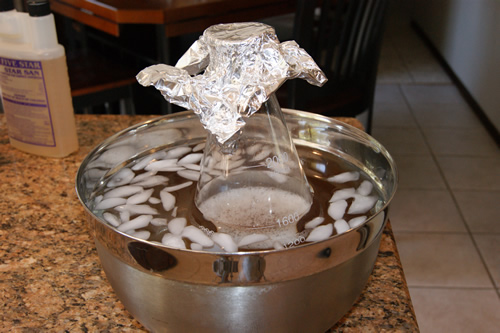 Carefully pour the solution into the Erlenmeyer flask. Cover the top of the flask in foil. Immerse the flask in an ice bath and leave the flask submerged until it has cooled to 70F, approx. 10-15 minutes.
