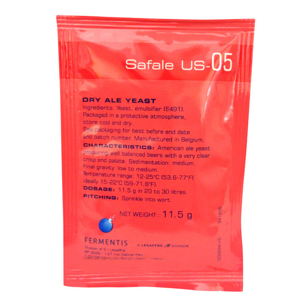 • Safale US-05 is one of our favorite dry yeasts. It is essentially a dry version of the classic American ale strain offered by other yeast manufacturers, and exhibits all the same qualities that make these yeasts so popular. A clean, neutral flavor profile is produced, and acts as the perfect base on which to build excellent American style beers. Often used in pale ales and IPAs, it is a versatile strain that can be used in almost any style. It is relatively attenuative, ferments well and clears well with a little time. It can be used when hops, malts, or both are to be accentuated. All of these attributes make it an ideal choice as a house strain. This is definitely a great yeast to have a pack of on hand for brewing emergencies!