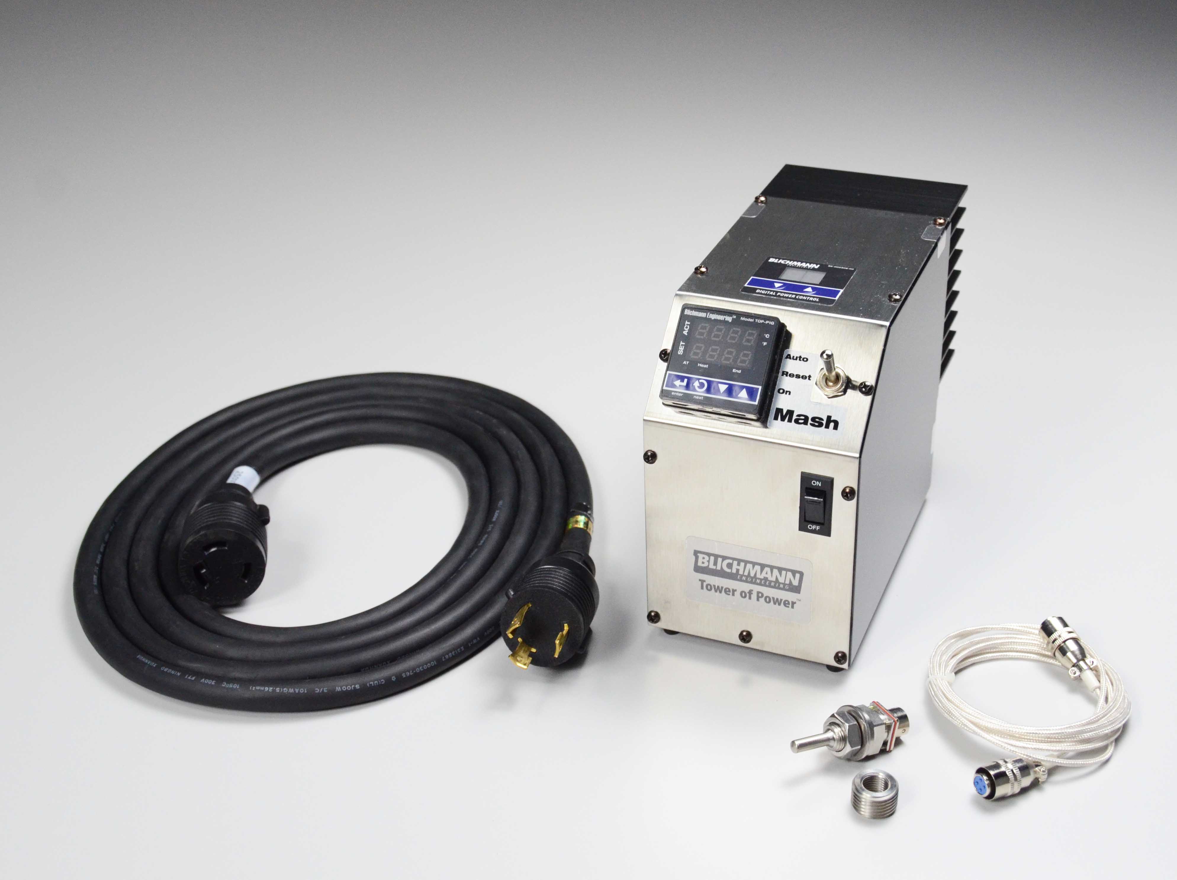 An amazing way to automate a RIMS or HERMS system! Now available in electric, these controllers will work in concert with our suite of equipment options to complete your Blichmann Engineering™ system or act as a freestanding control powerhouse! The Electric TOWER of POWER™ offers superior precision and accuracy. The control module will hold your mash within +/- 0.5°F (1°C). Includes industrial ignition electrode and high quality silicone/carbon fiber ignition wire. Monitors the temperature of your mash tun or HLT (or if you have two Control Modules, both).,,Control Module will include:,,,Class A precision RTD temperature sensor. The sensor can be installed in BrewMometer™ hole in your kettle for an HLT or into any 1/2" NPT fitting with the included adapter bushing.,,,Power control to meter the intensity of the heating element from 0-100%.,,,Optional low level shut off port.,,,Optional Low level kettle switch deactivates heating element to avoid dry firing and potential scorching with element exposed to air. Simply connect low level switch installed in kettle to the TOWER of POWER control module and you are protected from dry firing and potential scorching with element exposed to air. Switch available factory punched for easy installation or as an after purchase add on.,,,Data port for optional remote monitoring and mash-profile programming (unlimited profiles) on your PC (Optional communication cable required).,,,One decal for MASH and one for HLT for appropriate labeling.,,,Compact enclosure of 4.25"W, 7"H, 7"D that is easily integrated into your brew system.,,,Brushed stainless cover and gloss black powder-coated case that will look beautiful for years!,NOTE: Requires 240 v plug for Connectivity.
