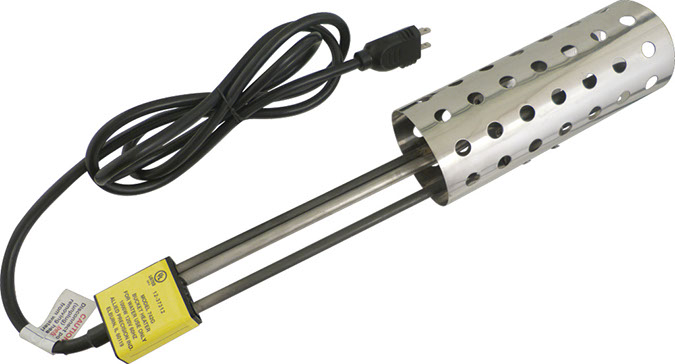 Preheat your mash before beginning the brewing process with this Electric Bucket Heater 1000w from MoreBeer! This handy little tool works in conjunction with a product like the Ranco or Johnson temperature controller by enabling you to set an exact hot liquid temperature on the controller, and then attaching it to the bucket heater. The temperature controller will turn off the bucket heater once it reaches your desired temperature. Our bucket water heater is designed to use with water in a bucket or cooler where an open flame cannot be used, and you can even use it to heat a bucket of water for cleaning with a powdered brewery wash.,This water bucket heater measures 17 inches from the handle to the tip and comes with a 6-foot long cord. It requires at least 6 inches of water for full submersion, and it can only be used with a maximum depth of 14 inches. Unit has stainless steal heating element and guard. Does not include clip for mounting. ,,Please Note - Having electrical devices around liquid can be hazardous, and should not be left unattended. Please use caution while using this device, and read the instruction manual prior to use.