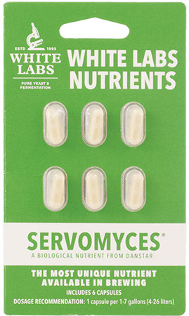 Add servomyces to your beer to increase yeast health because healthy yeast make better tasting beer. Other benefits include a decrease in fermentation time and increased alcohol potential. Servomyces stimulates the uptake of maltose which results in drier beer with higher alcohol yields. It is made by saturating beer yeast with zinc and then drying it. Zinc is a missing nutrient in wort and is more readily absorbed from dead yeast cells than by adding it directly as a mineral. Originally available only to professional brewers, this wonderful yeast nutrient is now to the homebrewing community, thanks to White Labs and Lallemand. Since it's introduction, we have been after White Labs to make a smaller, more easy-to-use version of the product. It wasn't until our very own Shea Comfort came up with the capsule idea that they were able to move forward and deliver this "super food" to us! Olin Schultz of MoreBeer did an intial side-by-side trial batch using "Servo" and found the beer with servo started faster, fermented quicker, and finished 1 gravity point less than the control batch. While it is not a cure-all pill for your brew, it offers the serious home brewer an easy, effective way to help ensure yeast health. Servomyces was developed in Germany at the Weihenstephan brewing school and the Munich University, so of course it conforms to the German Purity Law! Contains 6 capsules good for 5 gallons of wort each. Add Servo in the last 10 minutes of the boil. If your ferment does not require a boil ( as in a mead), open the capsule and add the Servomyces directly.
