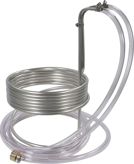 Few materials are more durable or more attractive than stainless steel, which is exactly what sets this Stainless Steel Wort Chiller from MoreBeer! apart from similar chillers. This high quality stainless wort chiller includes 8 feet of vinyl tubing attached to both the in and out using a female garden hose fitting on the “in” side, as well as 25 feet of stainless steel tubing measuring 3/8 inch diameter.,Although stainless steel takes a littlet longer to cool your worth than comparable copper tubing, its advantage is that it won’t tarnish between uses. Stainless steel is also much more affordable than copper, which makes this an economical choice that won’t sacrifice quality or real-world effectiveness. This stainless steel wort chiller also contains a brass faucet adapter for an even more attractive, high quality look and feel.,The Stainless Steel Wort Chiller 25’ x 3/8” from MoreBeer! is made entirely in the U.S. ,Note: The inner bend on the coils have small indentations that are a natural result of the winding process used during manufacturing. As an upside, these do actually help turbulate the cooling water to eliminate laminar flow (helps increase the cooling capacity). ,,Product Specifications,,,25' Stainless tubing,,,8' Vinyl Tubing,,,Brass Faucet Adaptor,,,10" diameter,,,8" to the top coil,,,15" to the bend to go over the lip of the kettle., ,,