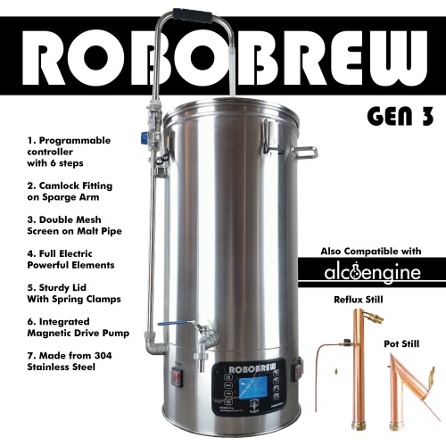 If you want to jump into all grain brewing right from your first batch, or as an upgrade from malt extract brewing, the Robobrew is a complete turn key solution. The Robobrew is an all-in-one electric brewery.